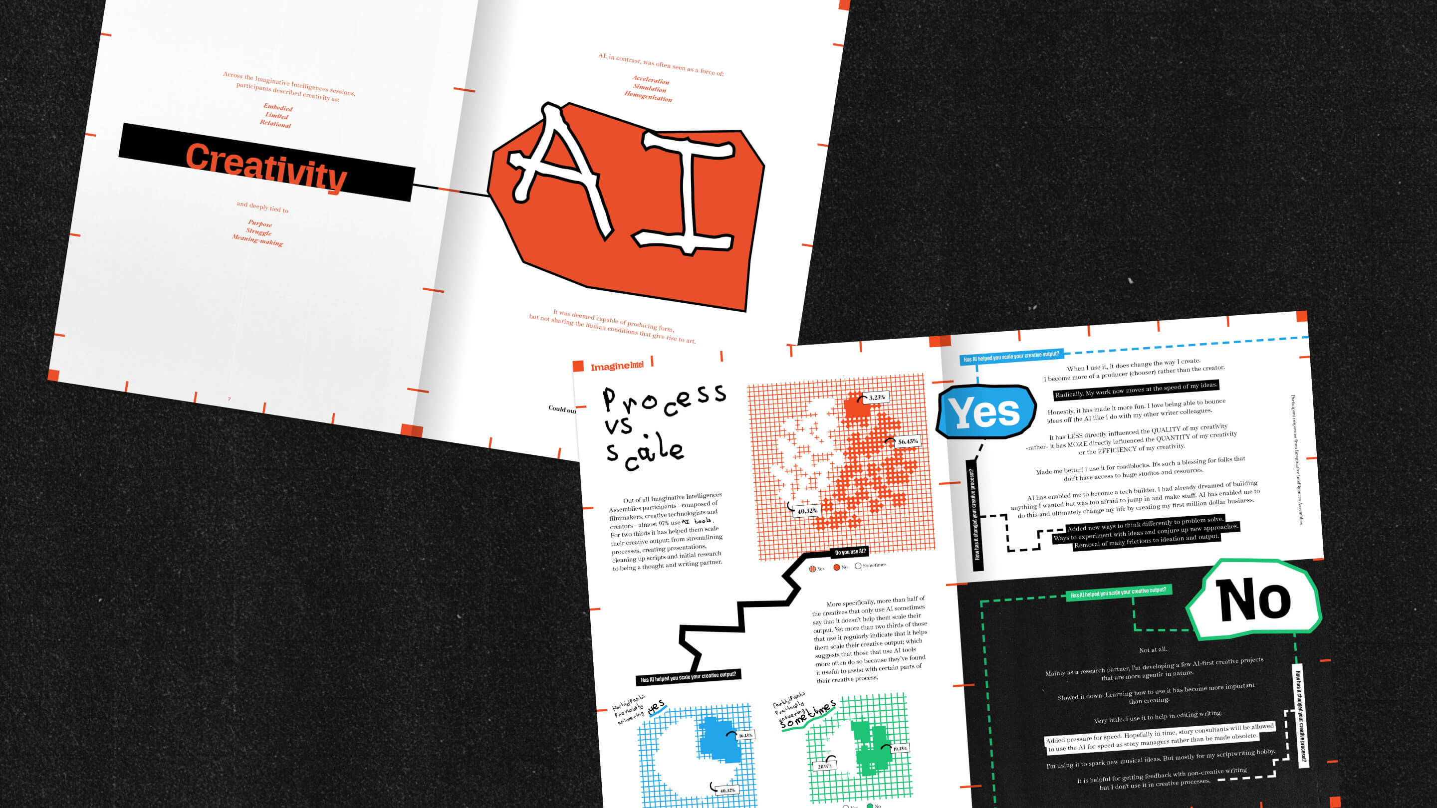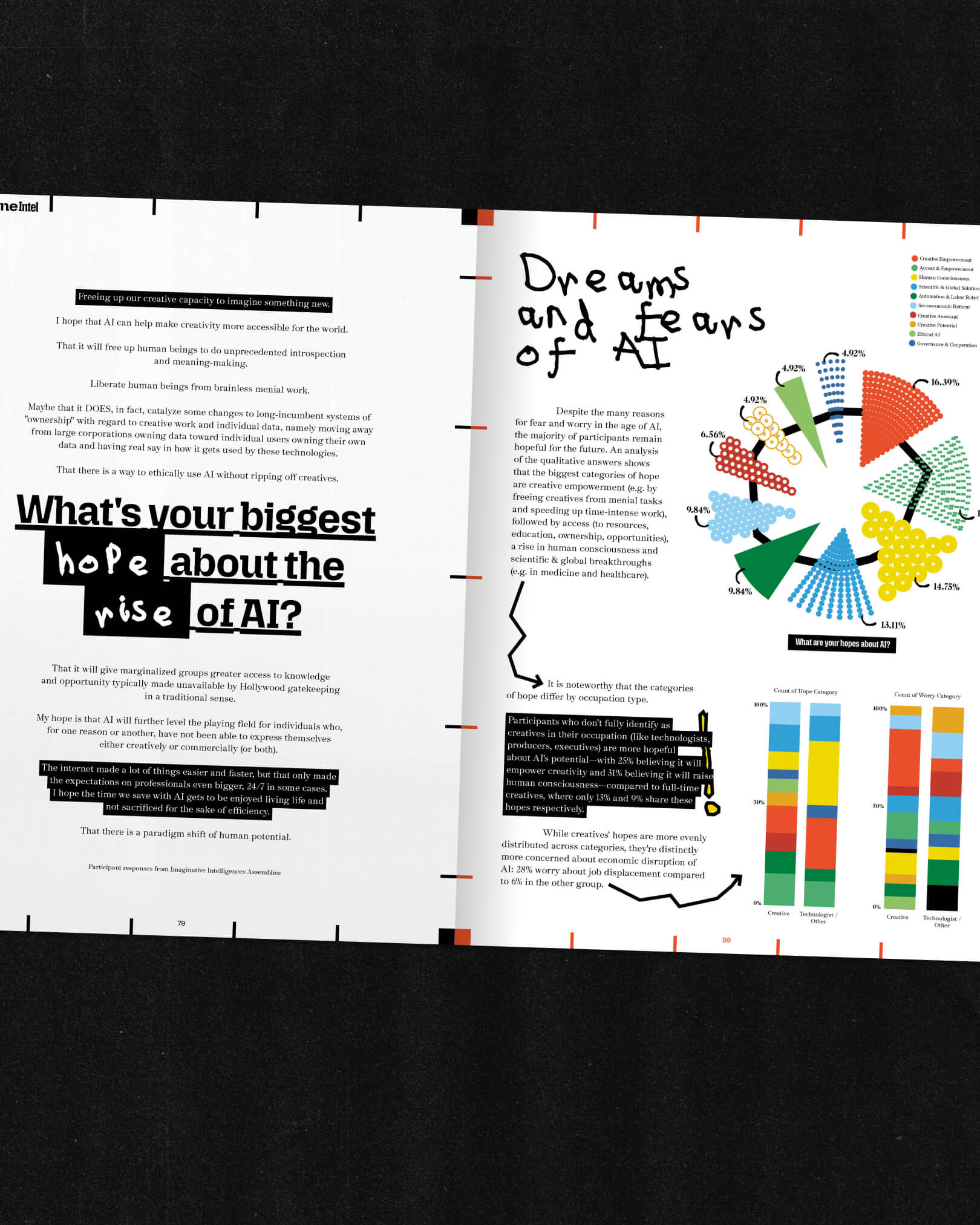 Created with a community-first editorial approach, the zine weaves real insights from working creatives with curated cultural references brought together through editorial design. At its core, Imagine Intel challenges dominant AI narratives, proposing creative futures shaped by communities (not corporations) and equipping creatives with the context to engage with AI on their own term.